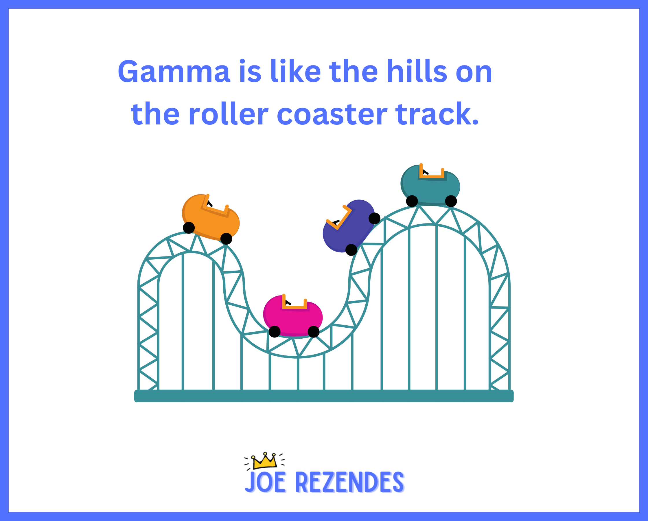 Imagine you're on a roller coaster, and you're trying to figure out how much the ride is going to go up or down. Gamma is like the hills on the roller coaster track. If the hills are big (high gamma), then the ride is going to be a lot more exciting (and the price of the option is likely to change a lot). If the hills are small (low gamma), then the ride is going to be a lot less exciting (and the price of the option is likely to change less).