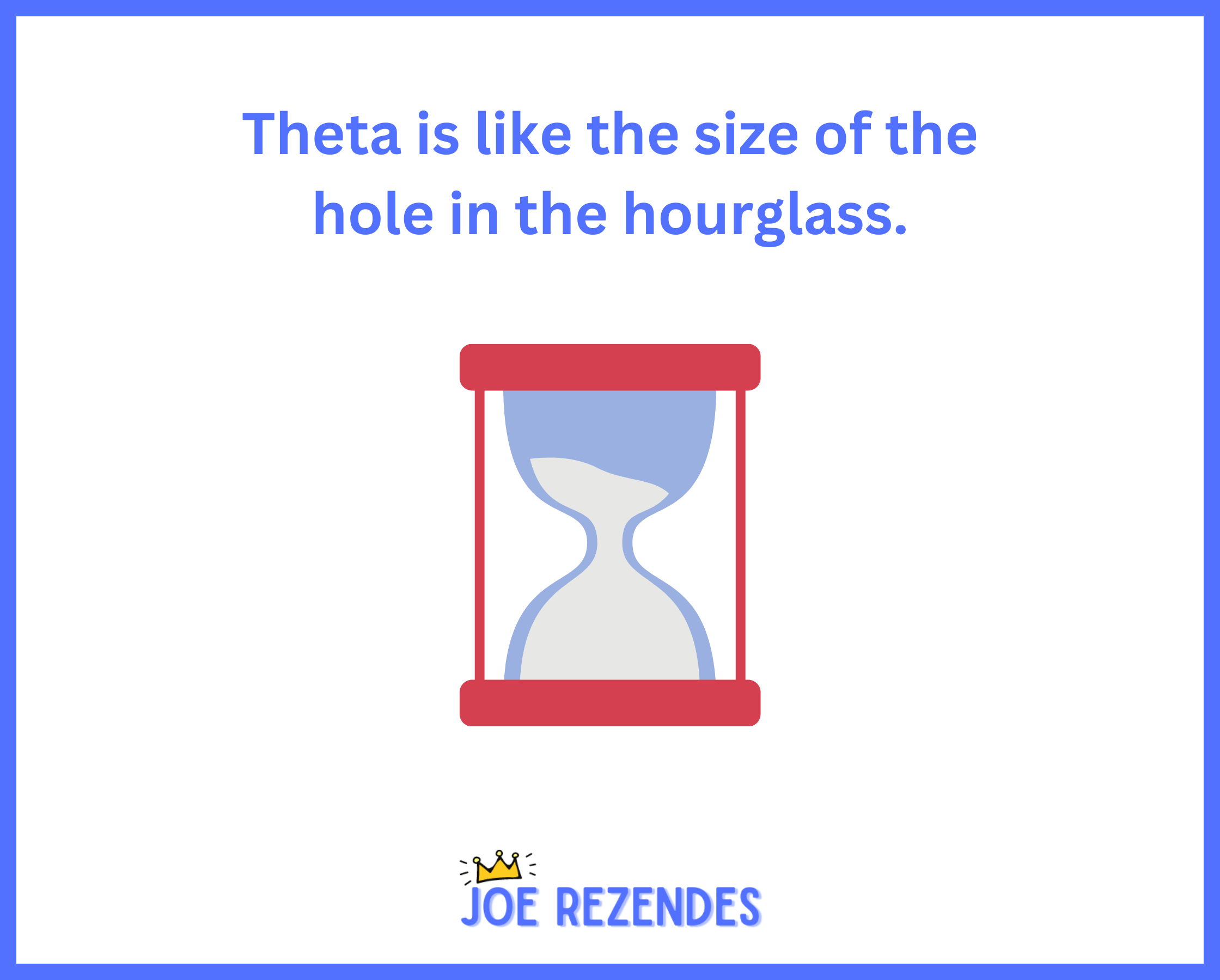 Imagine you have a hourglass, and you're trying to figure out how much sand is going to fall through the narrow part in the middle in a certain amount of time. Theta is like the size of the hole in the hourglass. If the hole is big (high theta), then a lot of sand (value) is going to fall through in a short amount of time. If the hole is small (low theta), then not much sand (value) is going to fall through in the same amount of time.