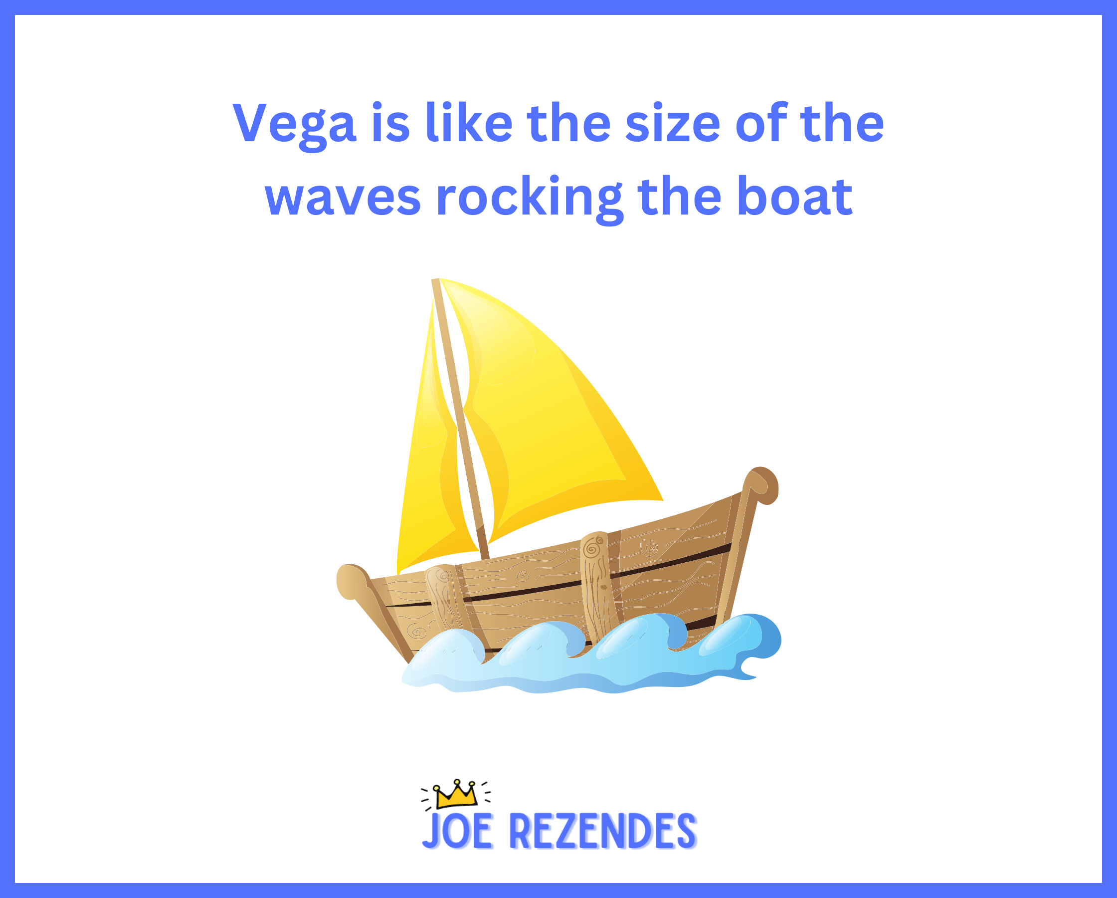 Imagine you're on a boat, and you're trying to figure out how much the boat is going to rock back and forth. Vega is like the size of the waves. If the waves are big (high vega), then the boat is going to rock a lot (and the price of the option is likely to change a lot). If the waves are small (low vega), then the boat is going to rock less (and the price of the option is likely to change less).